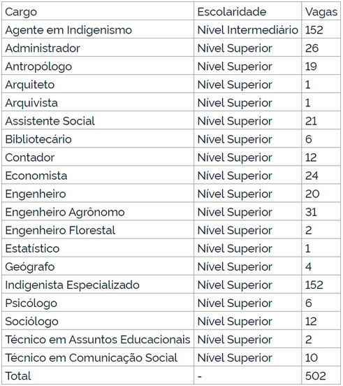 O Ministério da Gestão e da Inovação em Serviços Públicos autorizou, na terça-feira (2), o concurso da Fundação Nacional dos Povos Indígenas (Funai). O certame oferece, ao todo, 502 vagas de níveis superior e intermediário.