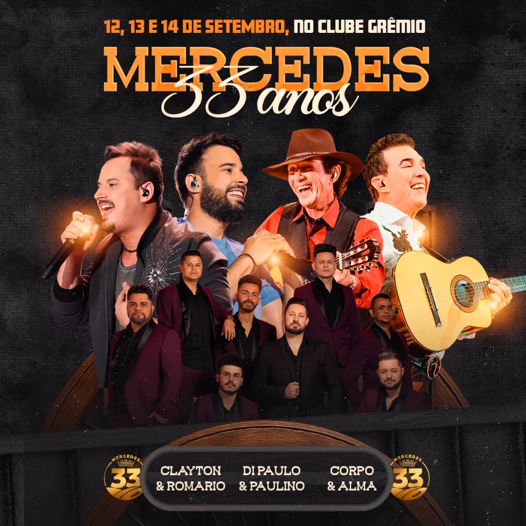 Além do concurso e do tradicional almoço, a festa terá shows gratuitos com Clayton & Romário e Bob Maicon na sexta-feira (12); Di Paullo & Paulino no sábado (13); e Evandro & Liliane, Ball & Wagner, Corpo & Alma e Banda Buana no domingo (14). Nos três dias também haverá a Expo Mercedes, praça de alimentação e feira do comércio, toda a estrutura no Clube Grêmio.