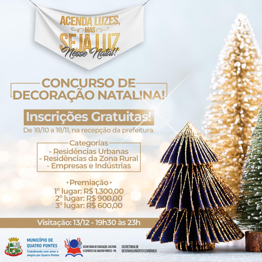 Continuam abertas as inscrições ao Concurso de Decoração Natalina ‘Acenda luzes, mas seja luz nesse Natal’, promovido pelas Secretarias de Educação, Cultura e Esportes e de Desenvolvimento Econômico de Quatro Pontes com o intuito de incentivar a população em transformar o município em um cartão de visitas, despertando o espírito e a magia que há nas tradições natalinas.