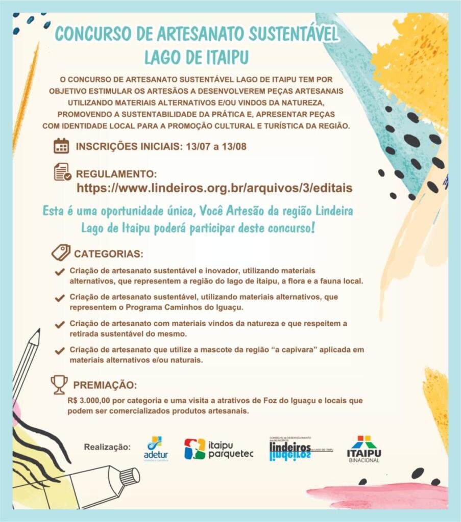 O Conselho de Desenvolvimento dos Municípios Lindeiros ao Lago de Itaipu, em parceria com o Itaipu Parquetec e a Agência de Desenvolvimento Cultural e Turístico da Região Cataratas do Iguaçu Caminhos ao Lago de Itaipu (Adetur), promove o “Concurso de Artesanato Sustentável ao Lago de Itaipu”. O objetivo é promover, incentivar e desenvolver artesanatos que refletem a identidade cultural, de maneira sustentável, criativa e inovadora, no entorno do lago de Itaipu.