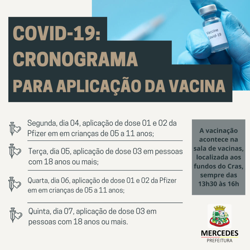 A Secretaria de Saúde de Mercedes dará sequência nesta semana ao cronograma de vacinação contra a Covid-19. Além da aplicação em adultos, crianças de 05 a 11 anos também terão acesso a segunda dose do imunizante.