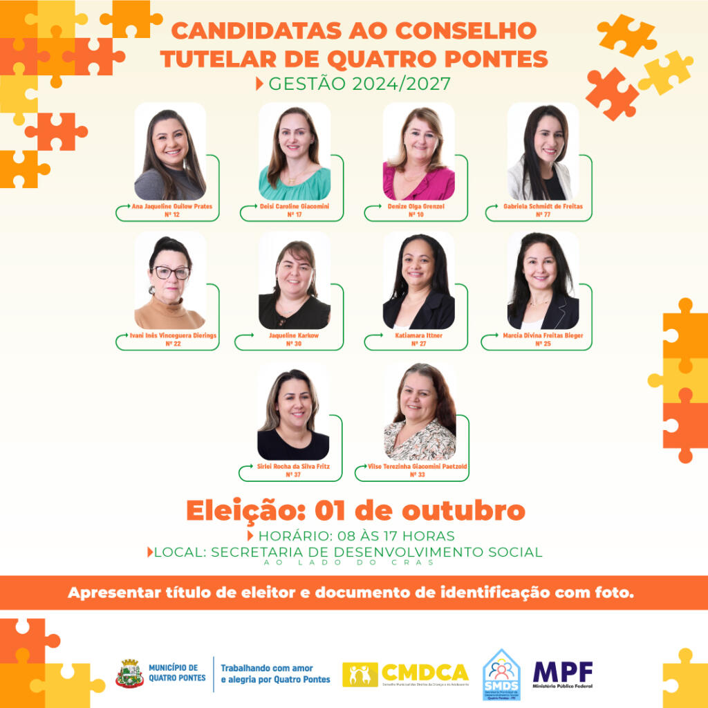 No dia 1º de outubro, dez candidatas irão disputar a eleição do Conselho Tutelar de Quatro Pontes, que será realizada pelo Conselho Municipal dos Direitos da Criança e do Adolescente (Cmdca), com apoio da Secretaria de Desenvolvimento Social e fiscalização do Ministério Público. O período para votação será das 8 às 17 horas, junto à Secretaria de Desenvolvimento Social, ao lado do CRAS, devendo apresentar título de eleitor e documento de identificação com foto.