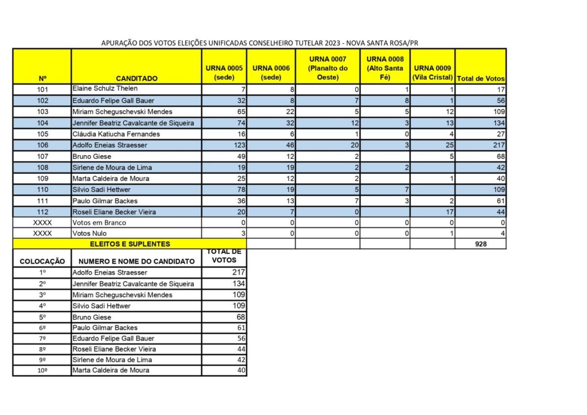 A Prefeitura de Nova Santa Rosa, por meio da Secretaria de Assistência Social e do Conselho Municipal dos Direitos da Criança e do Adolescente (Cmdca), divulga o resultado da eleição do Conselho Tutelar realizada no domingo (1°).