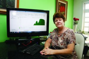 Engenheira civil Suely Aparecida Túlio Hey em frente ao computador onde um programa mostra em tempo real a produção de energia elétrica na residência (Fotos: Sandro Mesquita/OP)