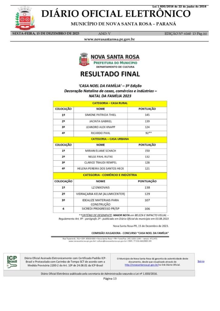 Confira o resultado do “Casa Noel Família” – Decoração Natalina de casas, comércios e indústrias – Natal da Família” da Prefeitura de Nova Santa Rosa: