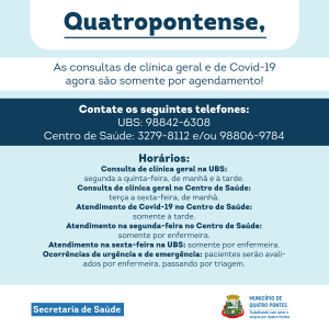 A partir de segunda-feira (09), os atendimentos de clínica geral e de Covid-19 serão prestados pela Secretaria de Saúde de Quatro Pontes somente perante agendamento. A alteração propõe melhorar o atendimento, diminuindo as filas, visto que a demanda diária é grande na Unidade Básica de Saúde (UBS) e no Centro de Saúde, unidade de referência para atendimentos respiratórios.