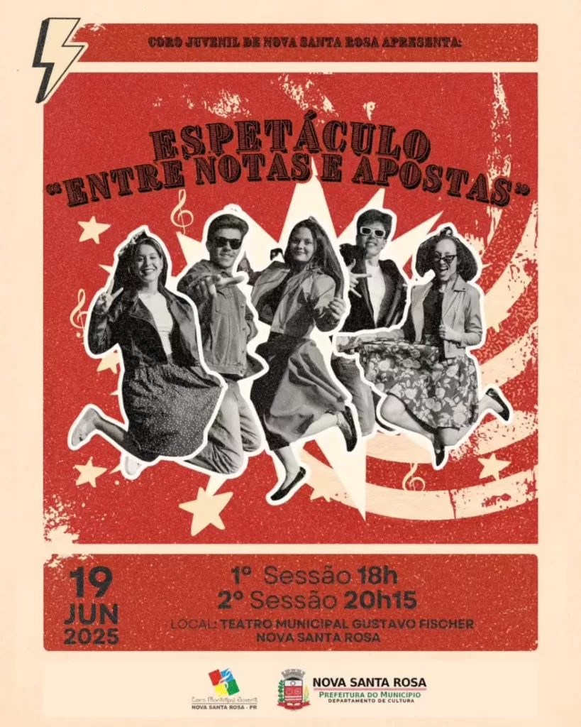 Nessa quinta-feira (19) feriado de Corpus Christi, o Coro Municipal Juvenil de Nova Santa Rosa apresentará espetáculo “Entre Notas e Apostas”, no Teatro Municipal Gustavo Fischer. A atração contará com duas sessões, às 18 horas e às 20h15. Ingressos estão disponíveis com os coralistas.