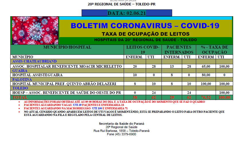 Conforme dados do Mapa de Ocupação de leitos, divulgado pela Secretaria de Saúde de Toledo na manhã desta quarta-feira (2), 39 pacientes da 20ᵃ Regional de Saúde aguardam leito de UTI.