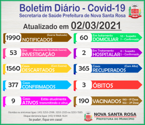 Os dados são atualizados diariamente pela equipe epidemiológica do Covid-19 que está atuando na linha de frente da pandemia na Secretaria de Saúde da Prefeitura de Nova Santa Rosa.