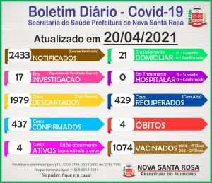 O município nova-santa-rosense contabiliza quatro óbitos em decorrência do coronavírus. Dos 2.433 casos notificados, 1.979 foram descartados com exame.