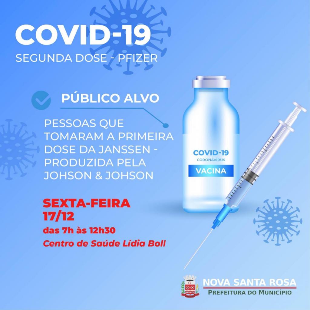 A Prefeitura de Nova Santa Rosa por meio da Secretaria de Saúde, informa que todos os pacientes que se vacinaram contra a Covid-19 com a Janssen produzida pela Johson & Johson (que era dose única), devem fazer o reforço da vacina com a Pfizer. O reforço pode ser feito nesta sexta-feira (17) das 7 às 12h30 no Centro de Saúde Lídia Boll.