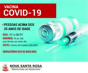 A Prefeitura de Nova Santa Rosa por meio da Secretaria de Saúde informa aos munícipes que nesta quarta-feira e quinta-feira (dias 07 e 08) das 7 horas às 18 horas – sem fechar ao meio dia – acontece a vacinação do Covid-19 para as pessoas acima dos 35 anos de idade.