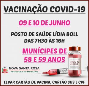 A Secretaria de Saúde da Prefeitura de Nova Santa Rosa, informa que recebeu nova remessa de vacinas para ampliar a vacinação no município. Sendo assim, os munícipes com idade de 58 e 59 anos serão vacinados nesta quarta-feira (09) e quinta-feira (10). Para receber a vacina é necessário levar o Cartão de Vacina e o Cartão SUS ou CPF.