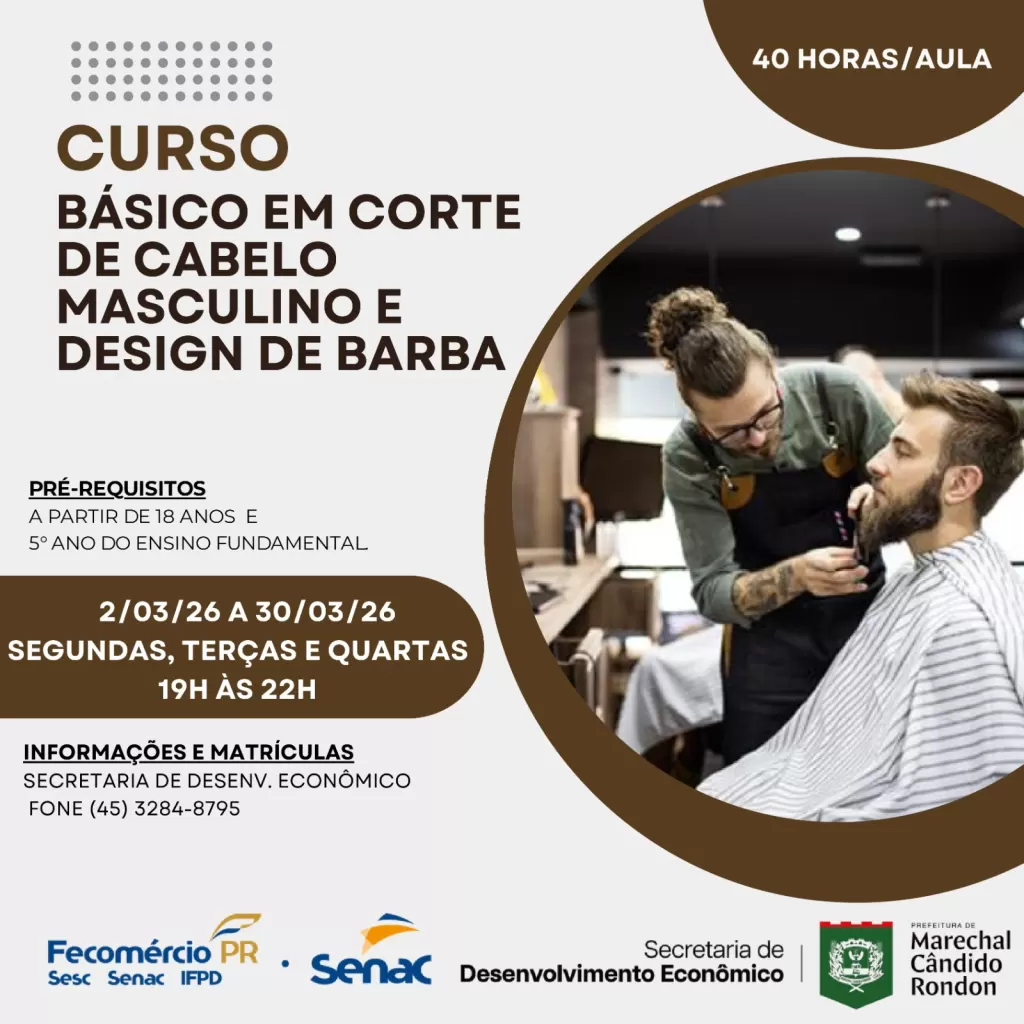 A prefeitura de Marechal Cândido Rondon, por meio da Secretaria de Desenvolvimento Econômico e da Sala do Empreendedor, em parceria com o Senac Marechal, está com inscrições abertas para o curso Básico em Corte de Cabelo Masculino e Design de Barba.