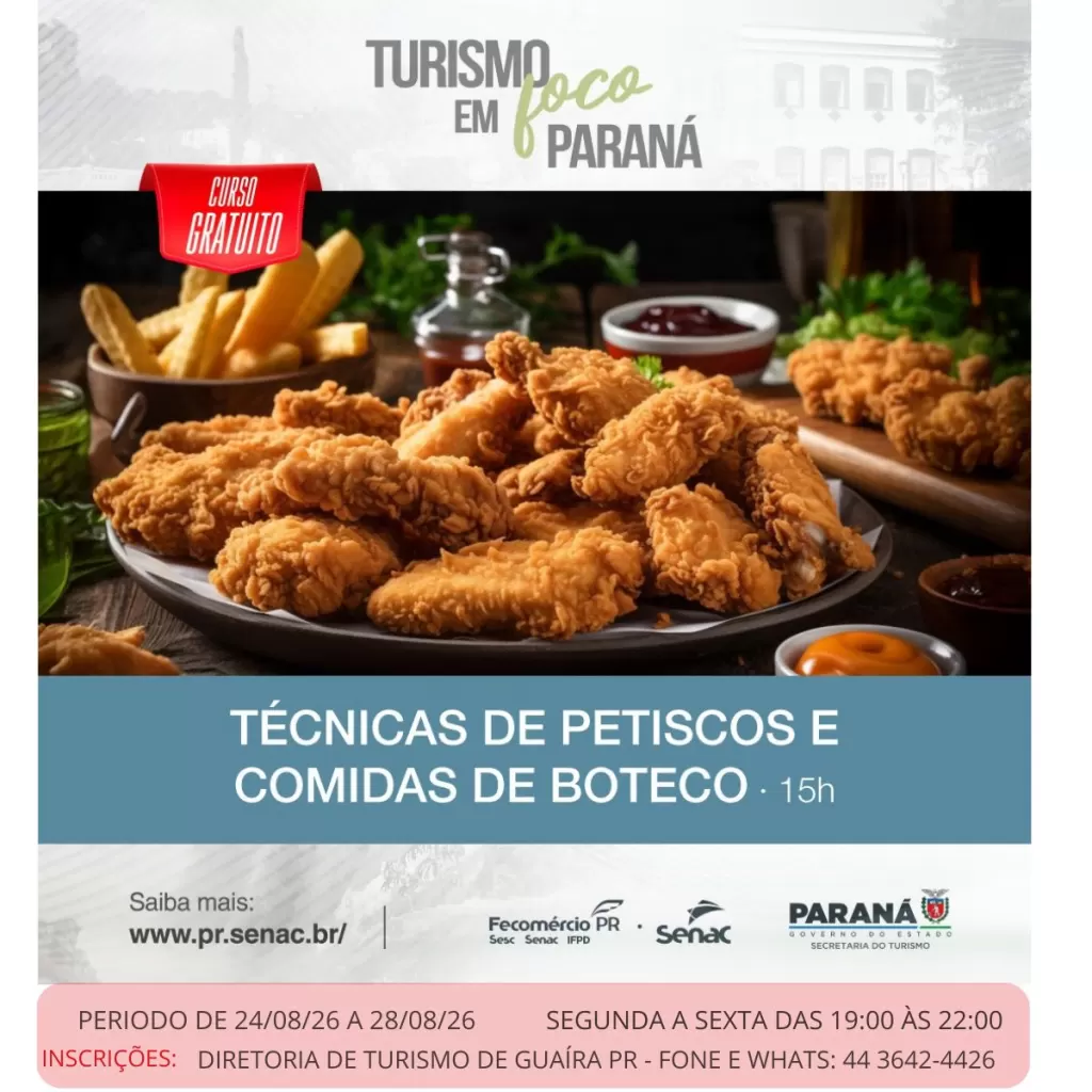 Também em Guaíra, estão abertas as inscrições para o curso “Técnicas de Petiscos e Comida de Boteco”, com carga horária de 15 horas. As aulas ocorrerão de 24 a 28 de agosto de 2026, de segunda a sexta-feira, no período noturno, das 19h às 22 horas. A proposta é capacitar os participantes no preparo de pratos típicos e ampliar conhecimentos na área gastronômica. Inscrições no endereço eletrônico (Clique aqui).