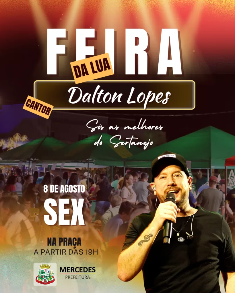 Nesta sexta-feira (7), a Praça de Mercedes receberá a tradicional “Feira da Lua” a partir das 19 horas. O evento contará com música ao vivo de Dalton Lopes.