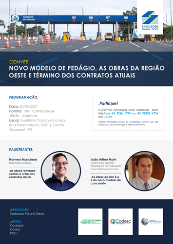 O primeiro deles é o deputado estadual Homero Marchese, que abordará o tema “As obras remanescentes e o fim dos contratos atuais”. O segundo palestrante é João Arthur Mohr, gerente de Assuntos Estratégicos da Federação das Indústrias do Paraná (Fiep). Ele abordará o tema “As obras dos lotes 5 e 6 do novo modelo de concessão”.
