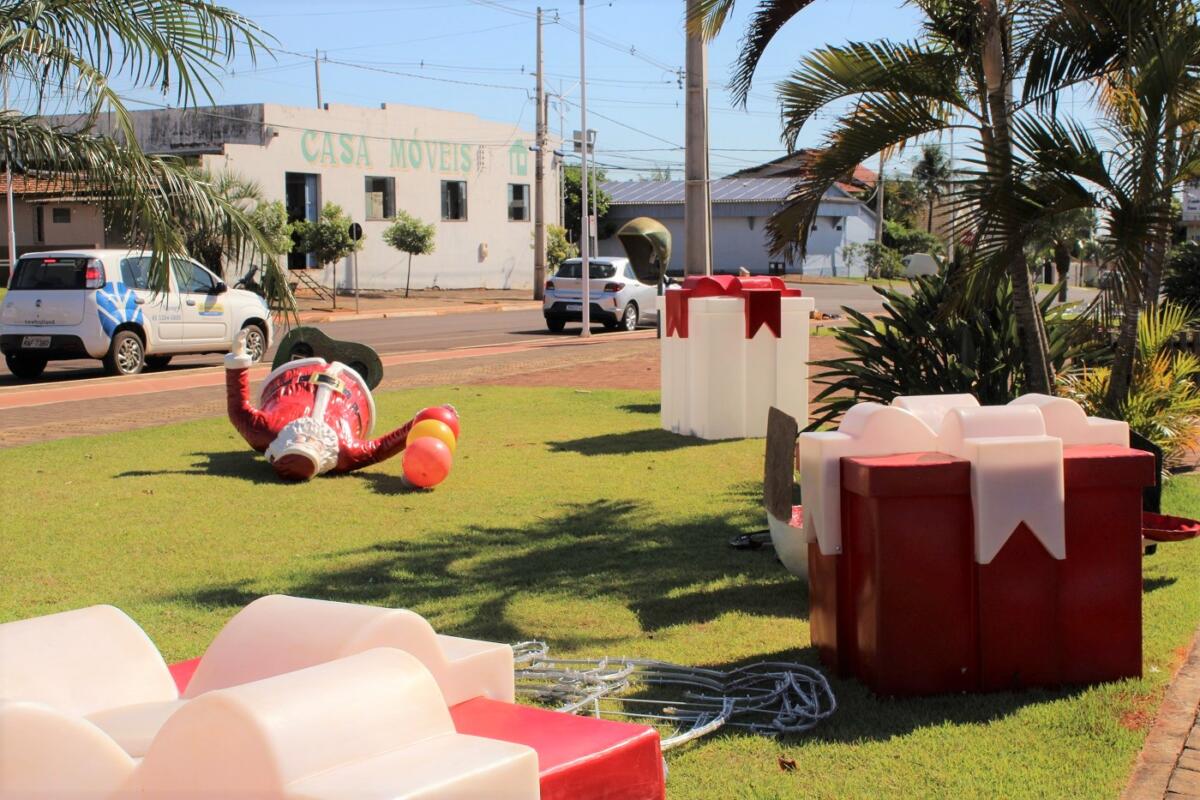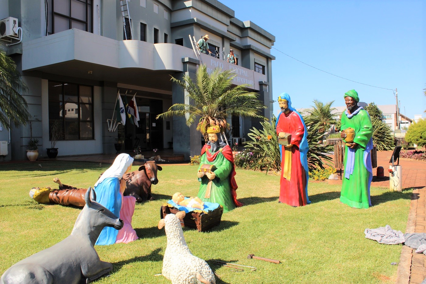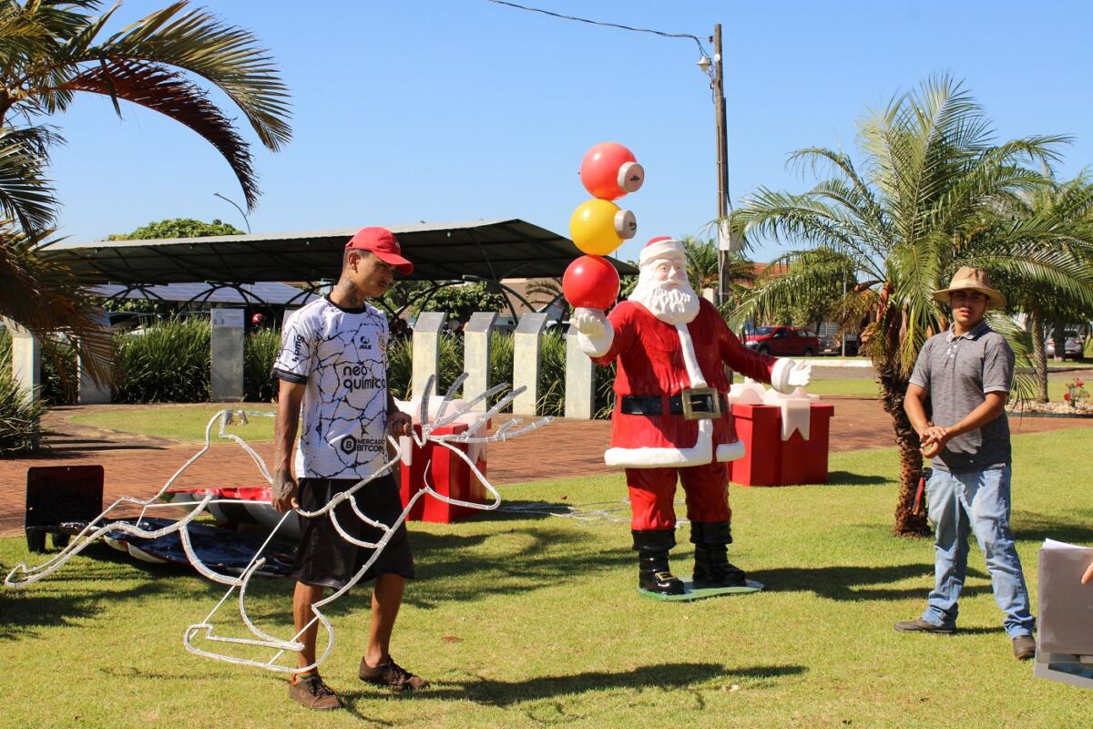 Além da decoração de luzes, estão sendo instalados papais-noéis, renas, bolas gigantes, presentes e o tradicional presépio.