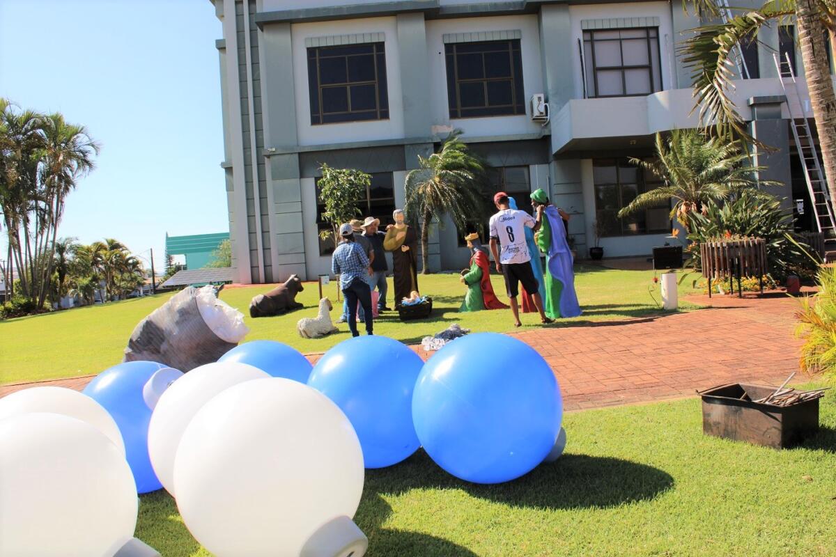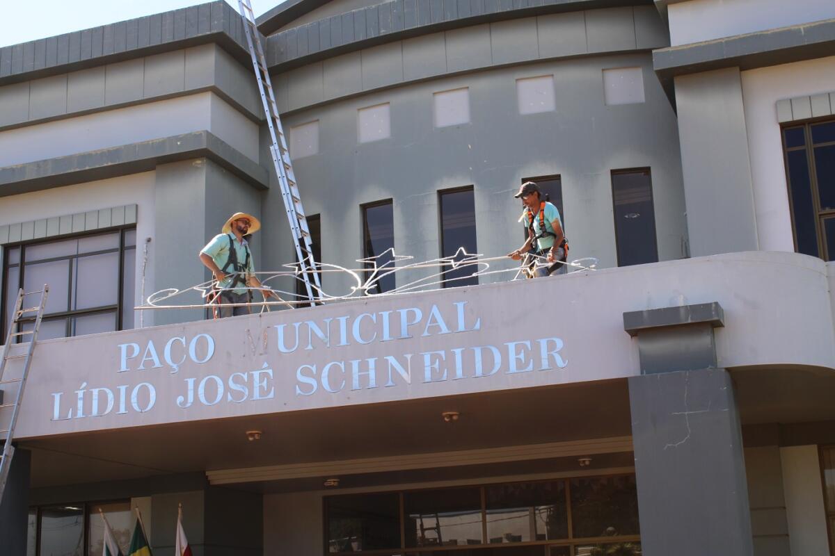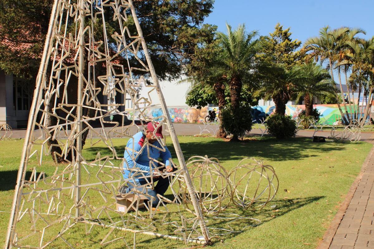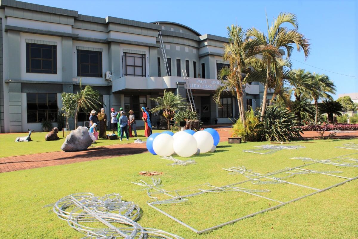 Além da decoração de luzes, estão sendo instalados papais-noéis, renas, bolas gigantes, presentes e o tradicional presépio.