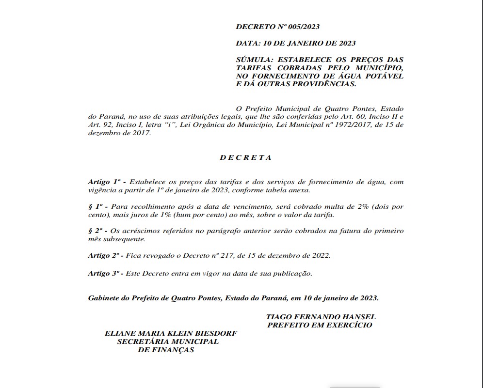 A Prefeitura de Quatro Pontes publicou na terça-feira (10), no Diário Oficial, o decreto nº 005/2023, que estabelece os preços das tarifas e serviços cobrados pelo município no fornecimento de água potável para 2023, com vigência desde o dia 1º. Atualmente, segundo a Divisão de Abastecimento de Água, ligada à Secretaria de Obras, Urbanismo e Transportes, há 1.780 ligações de água, divididas em 1.478 na categoria domiciliar, 137 na categoria comercial, nove somando as categorias industrial e especial e 156 na categoria rural.