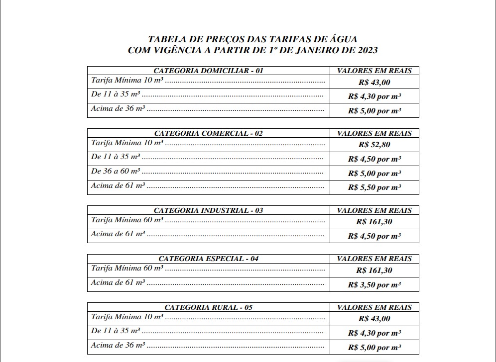 A tabela de preços na categoria domiciliar estipula R$ 43 para a tarifa mínima de 10 m³, R$ 4,30 por m³ de 11 à 35 m³ e R$ 5 por m³ acima de 36 m³; na categoria comercial, o custo da tarifa mínima de 10 m³ é de R$ 52,80, R$ 4,50 por m³ de 11 à 35 m³, R$ 5 por m³ de 36 a 60 m³ e R$ 5,50 por m³ acima de 61 m³; na categoria industrial, R$ 161,30 é a tarifa mínima de 60 m³ e R$ 4,50 por m³ acima de 61 m³; na categoria especial, o valor da tarifa mínima de 60 m³ é de R$ 161,30 e R$ 3,50 por m³ acima de 61 m³; e na categoria rural, R$ 43 é a tarifa mínima de 10 m³, R$ 4,30 por m³ de 11 à 35 m³ e R$ 5 por m³ acima de 36 m³.
