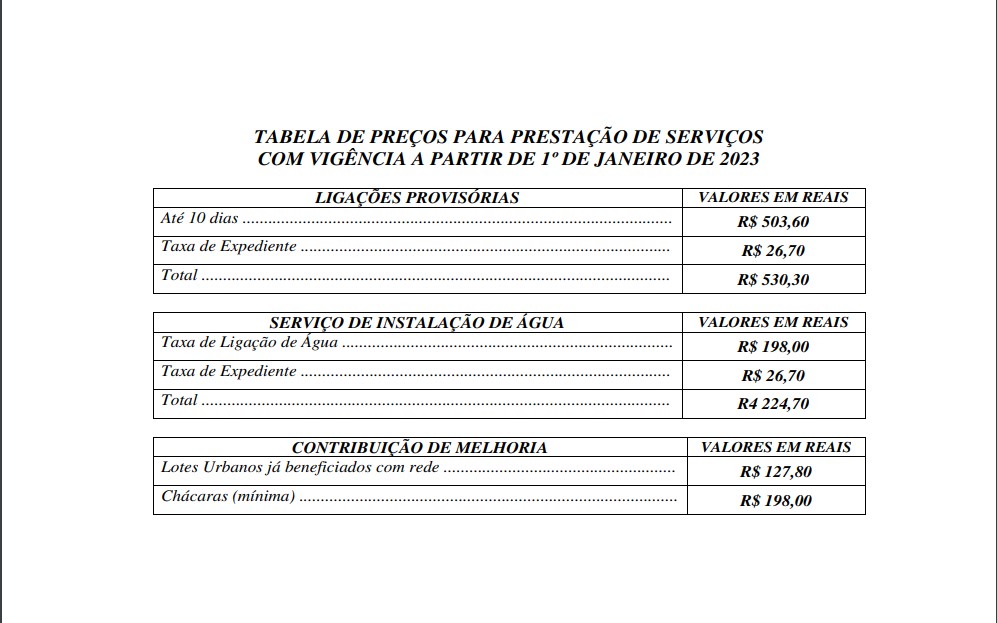 Na tabela de preços para prestação de serviços, o valor para ligações provisórias é de R$ 503,60 até dez dias e R$ 26,70 é a taxa de expediente, totalizando R$ 530,30. Sobre o serviço de instalação de água, o custo da taxa de ligação de água é de R$ 198 e a taxa de expediente R$ 26,70, somando R$ 224,70. E referente à contribuição de melhoria, o valor de R$ 127,80 é para lotes urbanos já beneficiados com rede e de R$ 198 para chácaras (mínima).