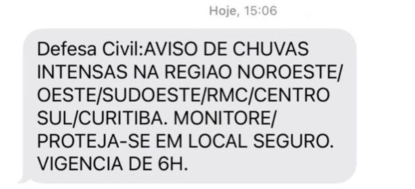 A Defesa Civil do Paraná emitiu, por volta das 15 horas desta sexta-feira (09), um alerta devido às condições do tempo no Estado. O aviso abrange as regiões Oeste, Sudoeste, Região Metropolitana de Curitiba (RMC), Centro-Sul e Noroeste, além da capital paranaense.