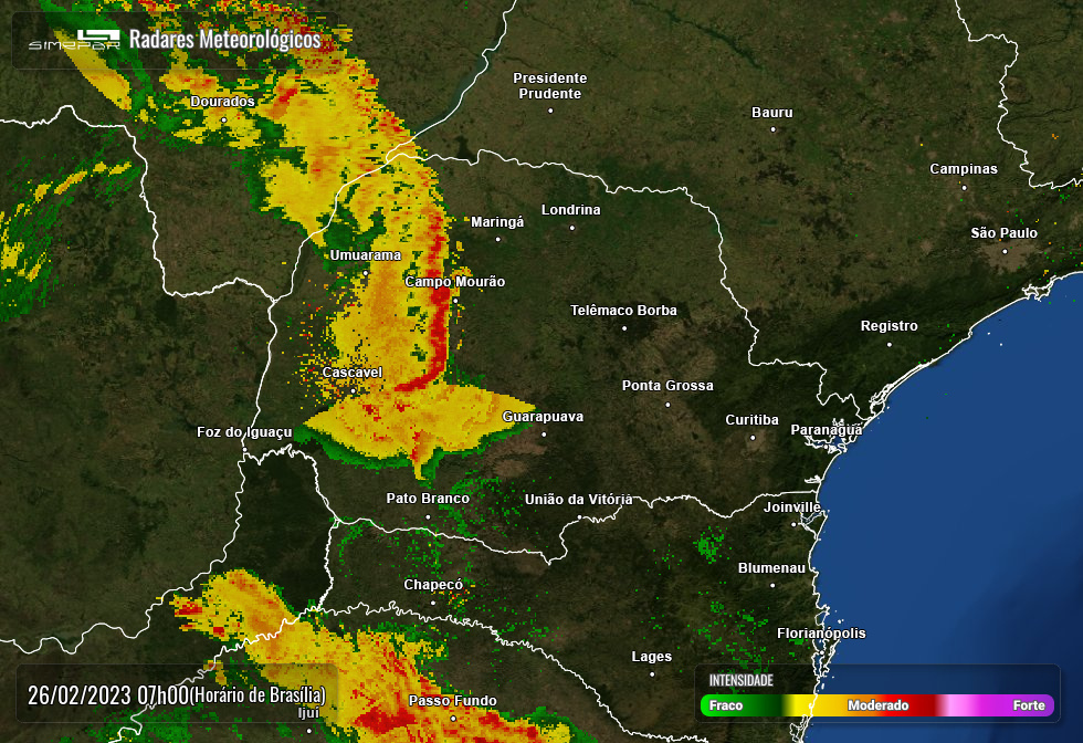 Neste domingo (26), o deslocamento de uma frente fria pelo oceano, na altura do Sul do país, reforça a instabilidade sobre o Paraná. Com isso, pancadas de chuva e raios foram registrados já na madrugada entre as regiões Oeste e Noroeste.