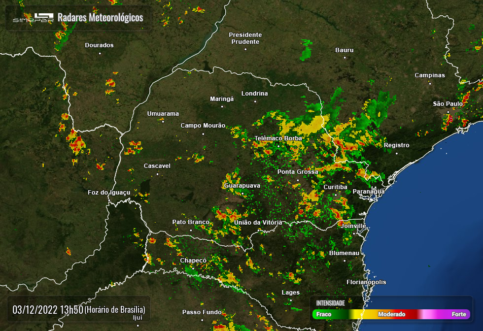 “Várias áreas e linhas de instabilidade atuam no Paraná nesta tarde de sábado. Deslocamento preferencial é de Noroeste para Sudeste. Neste momento as precipitações são mais fortes entre os Campos Gerais, Centro-Sul e o Leste do Estado. No Oeste e no Noroeste paranaense faz bastante calor”, explicou o meteorologista do Simepar, Samuel Braun, às 13h27.