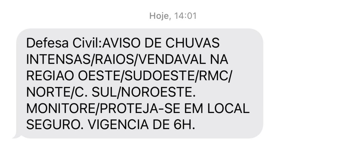 A Defesa Civil do Paraná emitiu novo alerta, às 1401 de hoje (03), sobre o risco de chuvas intensas, raios e vendaval na região Oeste. O aviso tem vigência de seis horas.