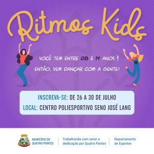 Uma nova oficina gratuita foi criada pelo Departamento de Esportes de Quatro Pontes. Trata-se da Ritmos Kids, lançada nesta segunda-feira (26) com a abertura das inscrições. O público-alvo engloba meninas de oito a 14 anos. Logo, os pais e/ou responsáveis pelas interessadas em participar devem ir até o Centro Poliesportivo Seno José Lang para efetivar a inscrição. O horário de atendimento é das 08 horas ao meio-dia e das 13h30 às 17h30.