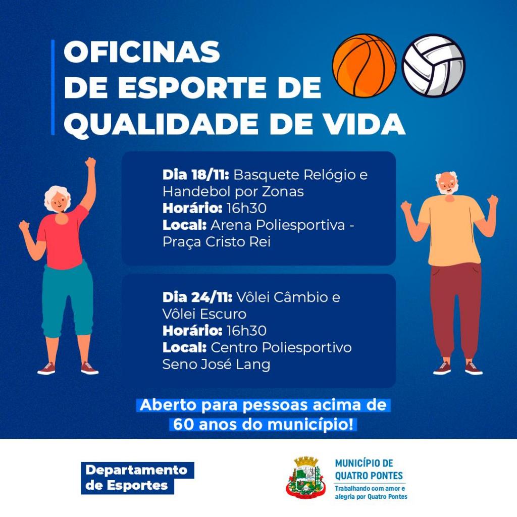 Duas Oficinas de Esporte de Qualidade de Vida serão promovidas pelo Departamento de Esportes de Quatro Pontes na quinta-feira (18), sendo basquete relógio e handebol por zonas. O início será às 16h30, na arena poliesportiva, junto à Praça Cristo Rei.