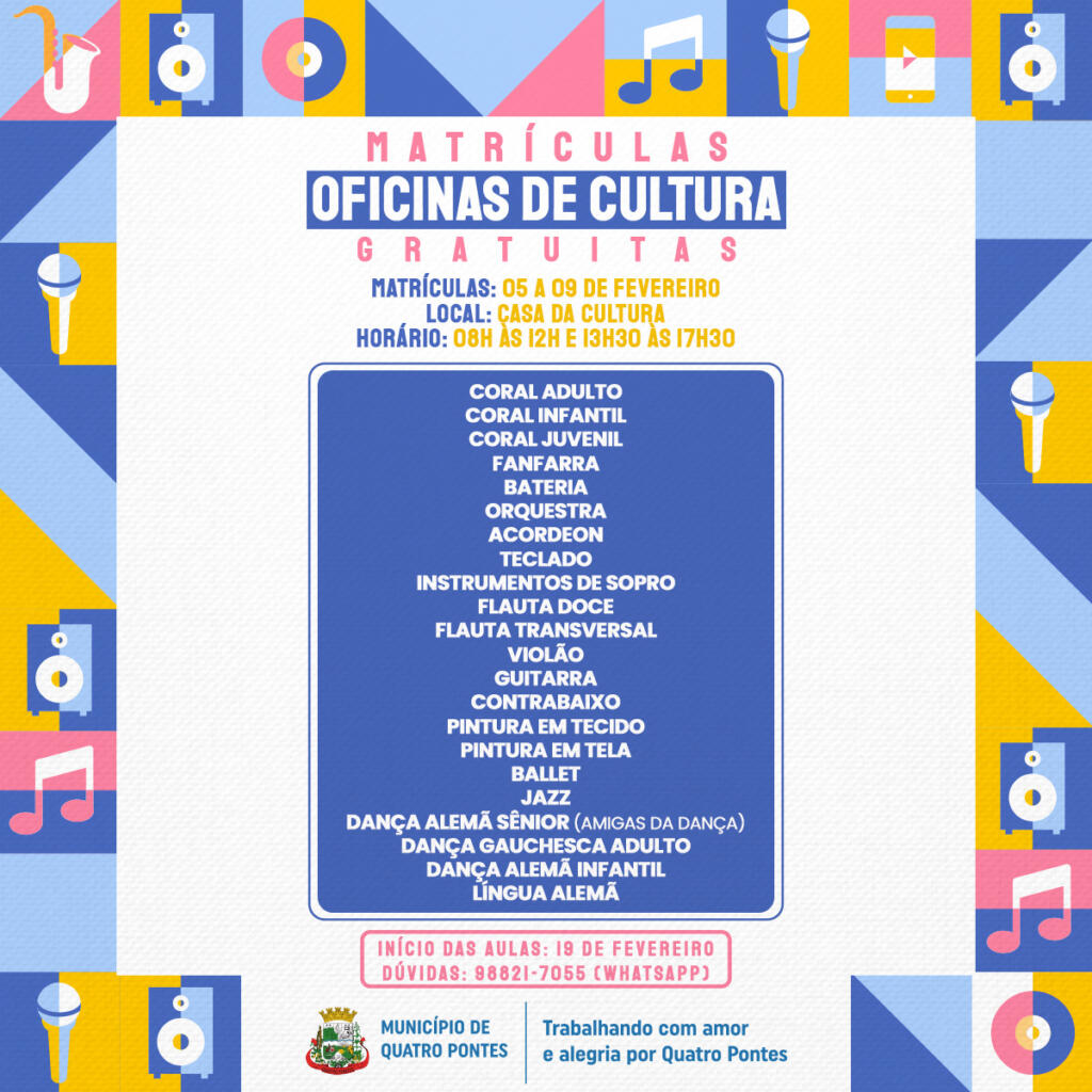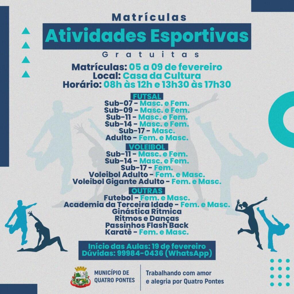 Até sexta-feira (9), os Departamentos de Esportes e de Cultura de Quatro Pontes realizam as matrículas para as atividades e oficinas gratuitas. Os pais devem ir à Casa da Cultura, das 8 às 12 horas e/ou das 13h30 às 17h30. Para efetivar a matrícula é necessário apresentar os documentos dos pais e do aluno/atleta e o comprovante de residência.