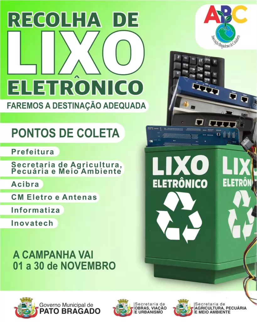 De 1 a 30 de novembro, a Secretaria de Agricultura e Meio Ambiente de Pato Bragado lança uma nova edição da Campanha de Coleta de Lixo Eletrônico. Essa ação vital tem como objetivo promover o descarte adequado de resíduos eletrônicos, protegendo nosso meio ambiente e fortalecendo a sustentabilidade na região.