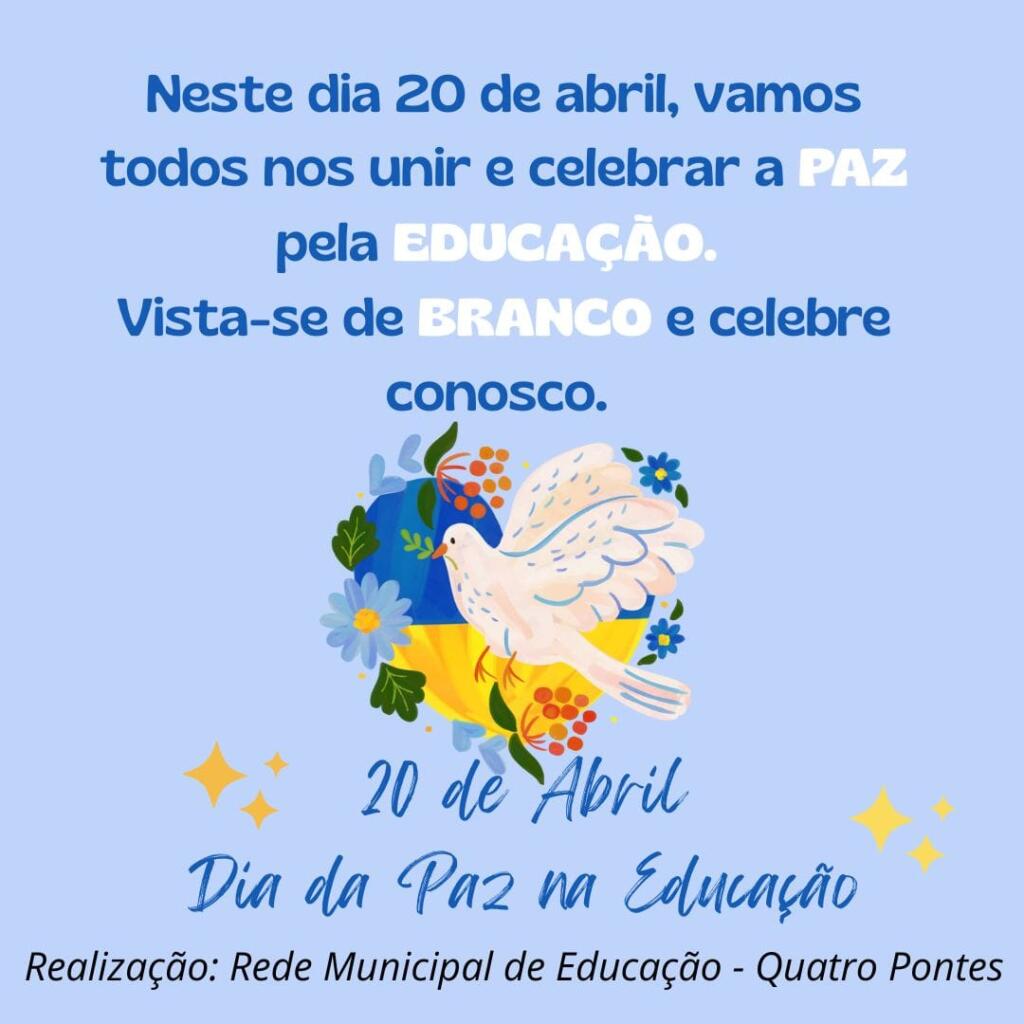 Com o registro de ataques em diversas escolas dopPaís, momento conturbado vivido pela educação, as instituições da rede municipal de ensino de Quatro Pontes, em parceria com a Secretaria de Educação, realizarão nesta quinta-feira (20) o ‘Dia pela paz na educação’.