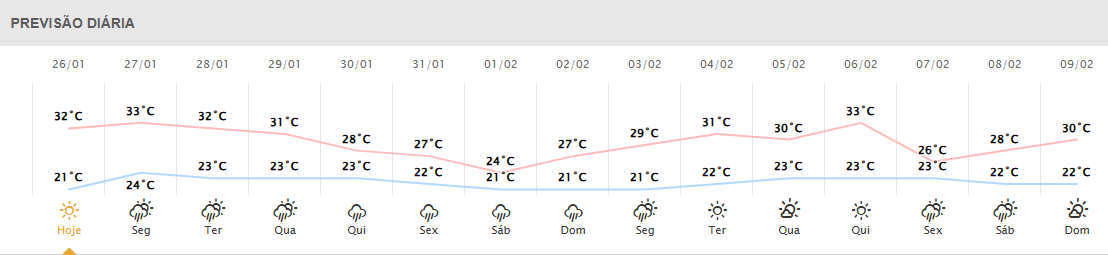 Foz do Iguaçu – Na fronteira, as condições são bem parecidas, o sol aparece bastante e não tem previsão de chuva. A temperatura mínima é de 23°C e a máxima é de 31°C.