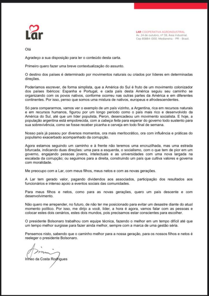 O diretor-presidente da Lar Cooperativa, Irineo da Costa Rodrigues, divulgou uma carta pública nesta sexta-feira (21).