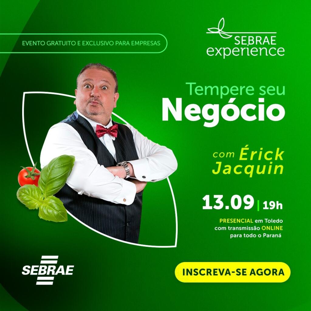 Na próxima semana, no dia 13 de setembro (terça-feira), a partir das 19 horas, empresários de Toledo e região poderão receber dicas especiais de como “temperar os negócios” com o chef francês Érick Jacquin. A programação faz parte da agenda do Sebrae Experience e será voltada aos empreendedores do ramo de alimentos e bebidas.