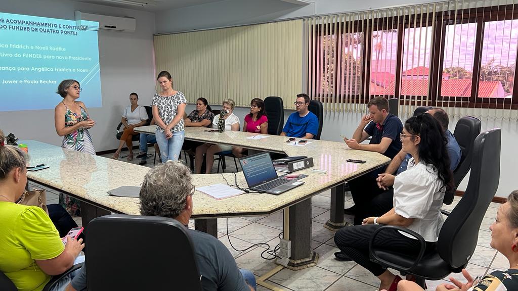 O prefeito de Quatro Pontes, João Laufer, e o vice e secretário de Administração, Tiago Hansel, deram posse na quarta-feira (04), na sala de reuniões da prefeitura, ao novo Conselho de Acompanhamento e Controle Social (CACS) do Fundo de Manutenção e Desenvolvimento da Educação Básica e de Valorização dos Profissionais da Educação (Fundeb), gestão 2023-2026. A presidente e vice-presidente agora é Ruth dos Reis Juwer e Paula Rejane Fulber Becker, respectivamente.