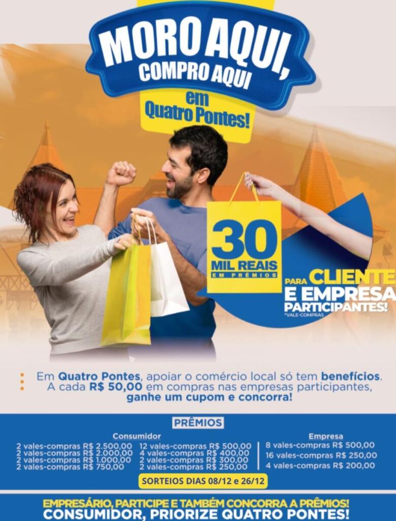 Regulamentado pelo decreto nº 205/2023, o programa ‘Moro aqui e compro aqui em Quatro Pontes’, consiste na realização de campanhas promocionais para incentivar o consumo de produtos e serviços locais e a distribuição de vales-compras no município. A participação no sorteio de prêmios será mediante a troca de notas ou cupons fiscais de prestação de serviços ou aquisição de bens de empresas com sede no município por cupons da campanha.