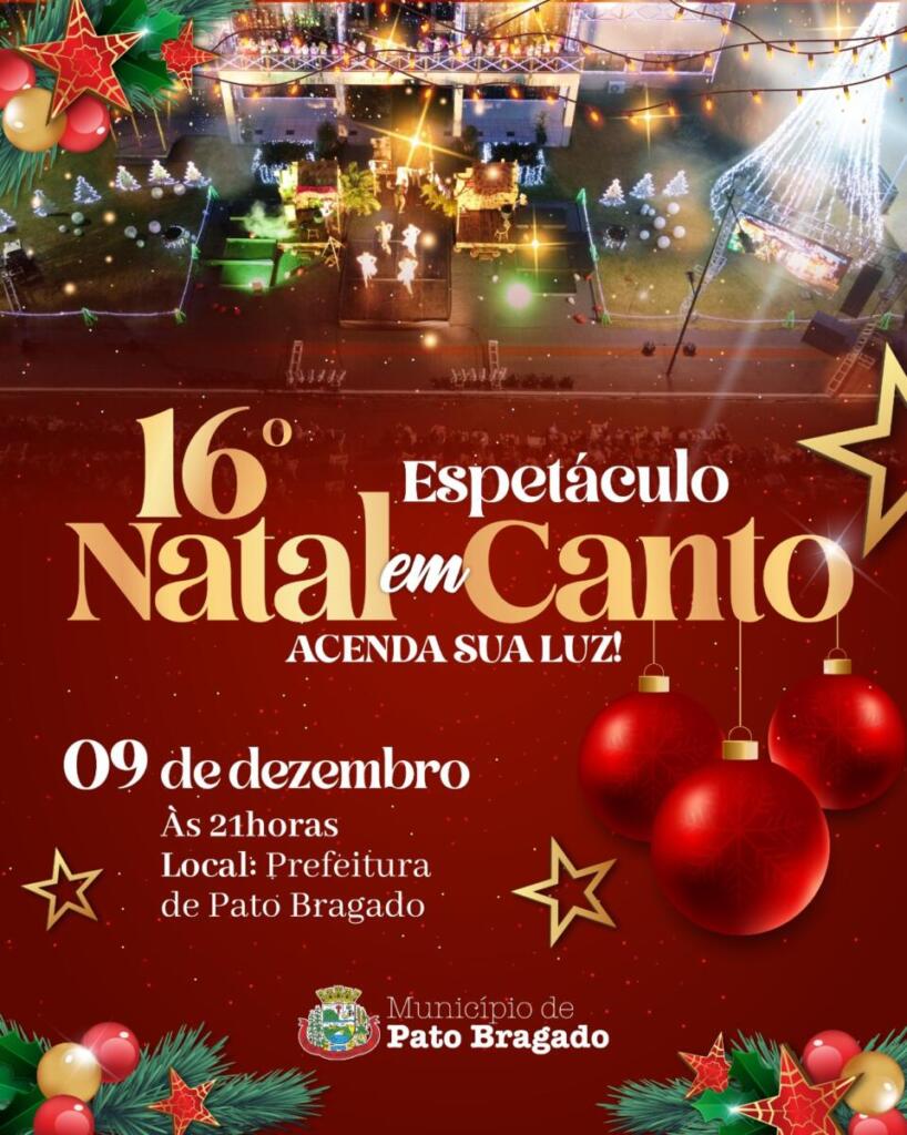 O espetáculo Natal em Canto chega a 16ª edição, neste sábado (9). Composto por uma equipe grandiosa de alunos e instrutores das oficinas do Centro Cultural Arte e Encanto, será apresentado a partir das 21 horas, na prefeitura de Pato Bragado.