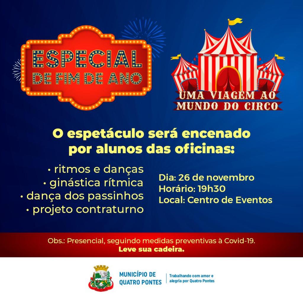 Intitulada “Um Natal para recomeçar”, a programação preparada pela Secretaria de Educação, Cultura e Esportes de Quatro Pontes será aberta nesta sexta-feira (26), com o espetáculo “Uma viagem ao mundo do circo”. O evento iniciará às 19h30, no Centro de Eventos Seno José Lang, e terá duração de 70 minutos.