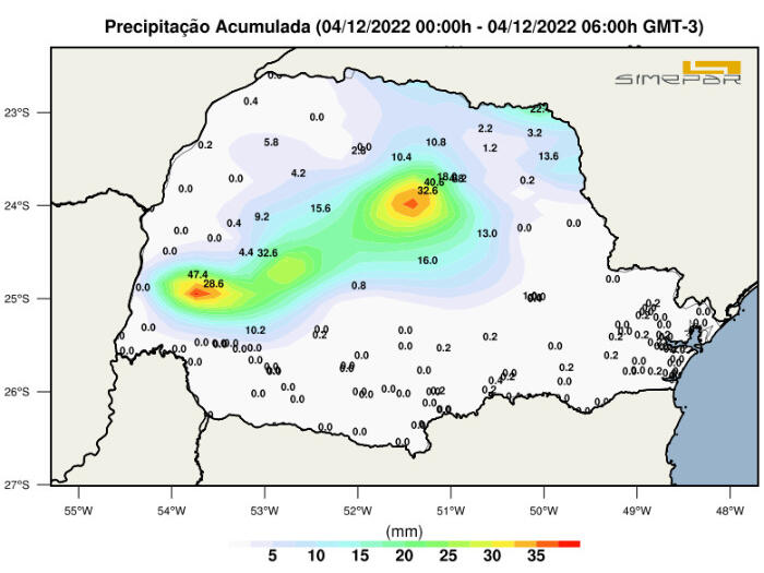 O domingo (04) amanheceu com muita nebulosidade no Estado nas últimas horas, com registro de chuvas principalmente entre porções mais a Oeste e Norte. A informação é o do meteorologista do Simepar, Fernando Mendonça Mendes. No mapa abaixo, é possível ver o acumulado de chuva pelas estações do Simepar.