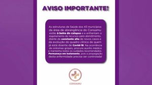 As estruturas de Saúde dos 43 municípios da área de abrangência do Consamu estão à beira do colapso e enfrentam o esgotamento de recursos para atendimento, diante da constante alta de novos casos e da evolução do quadro clínico de quem já está doente de Covid-19. Na ocorrência de sintomas gripais, procure auxílio médico e mantenha todos os cuidados recomendados. Permaneça em isolamento, pois a propagação desta enfermidade precisa ser controlada!”.