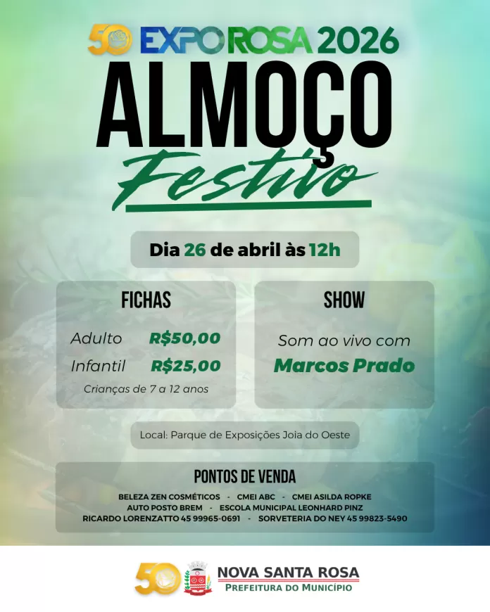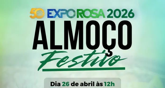 A programação da Expo Rosa 2026 contará com um momento especial de confraternização para toda a comunidade: o tradicional Almoço Festivo, que será realizado neste domingo (26), a partir das 12h, no Parque de Exposições Joia do Oeste.