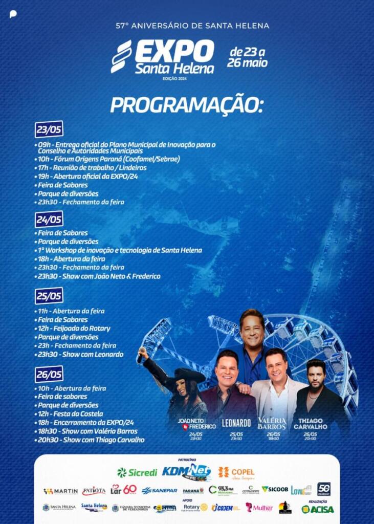 No sábado (25), a Expo Santa Helena reabrirá suas portas às 11 horas. O destaque do dia será a Feijoada do Rotary ao meio dia, além do show de Leonardo às 23h30.