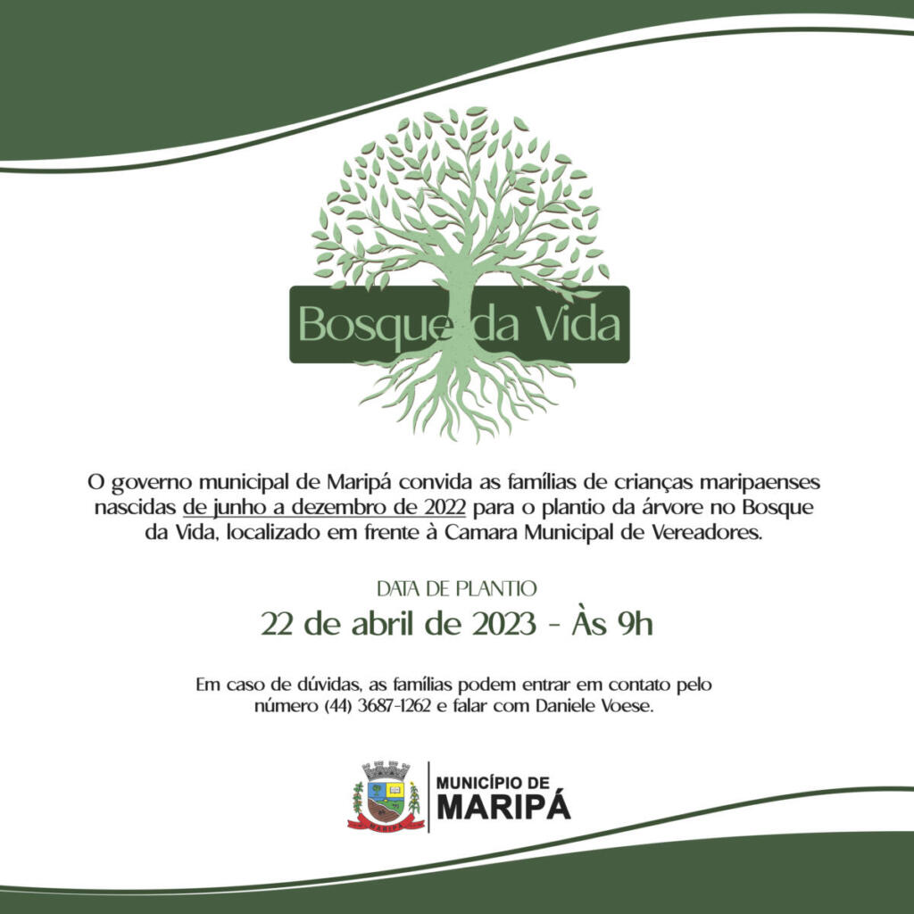 O governo municipal de Maripá convida as famílias de crianças maripaenses nascidas no 2º semestre de 2022 para realizar o plantio da árvore no Bosque da Vida. O plantio ocorrerá neste sábado, 22 de abril, às 9 horas. O espaço está localizado em frente à Câmara Municipal de Vereadores.