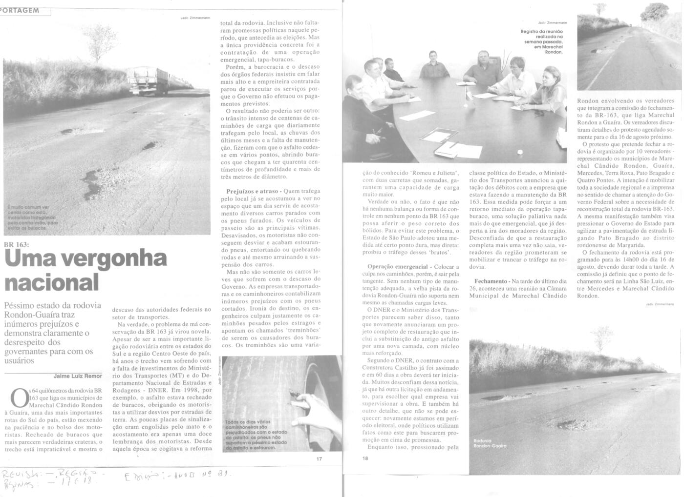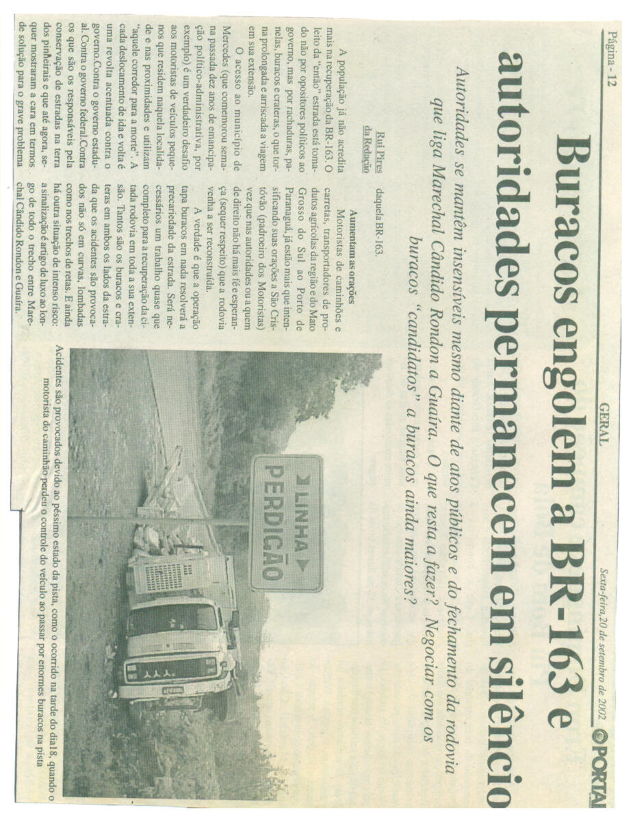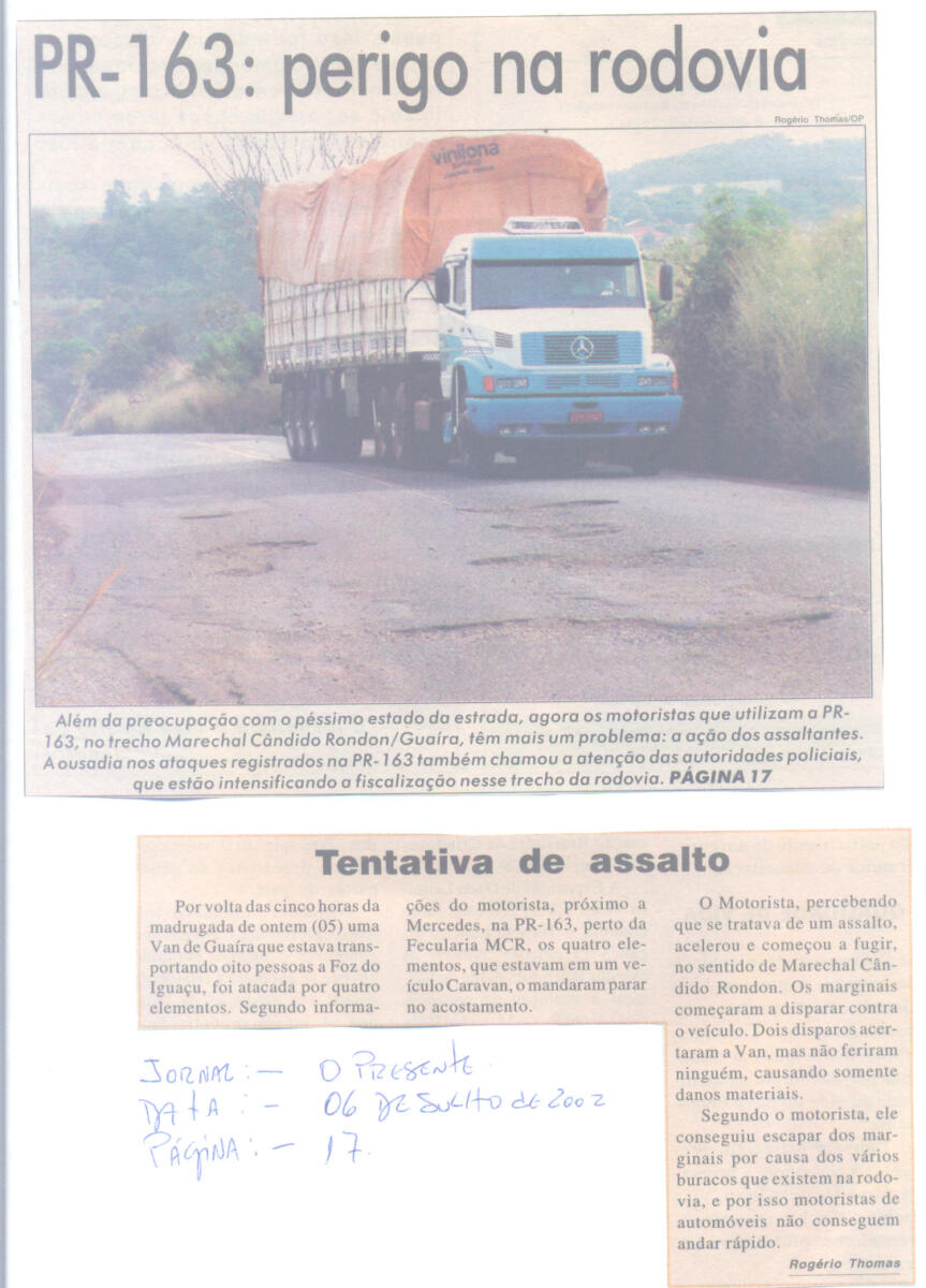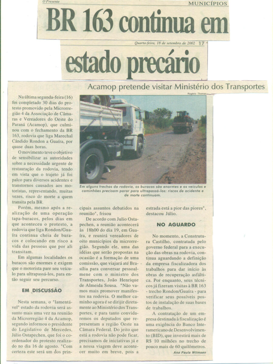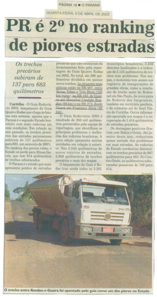 Naquela “altura do campeonato”, conforme publicação do Jornal O Paraná de 9 de abril de 2003, o Estado do Paraná ocupava o 2º lugar no ranking de piores estradas, sendo o trecho da BR-163 entre Guaíra e Marechal Rondon um dos mais críticos na época.