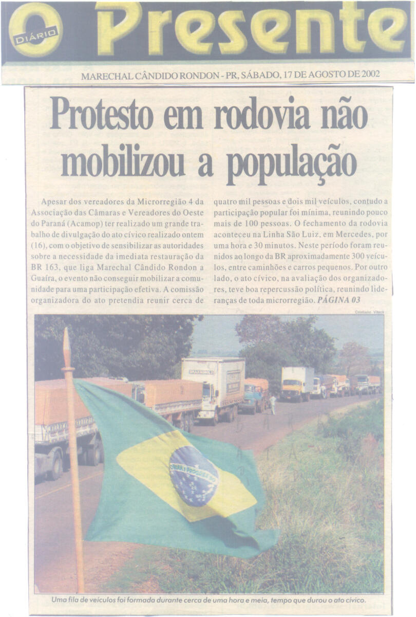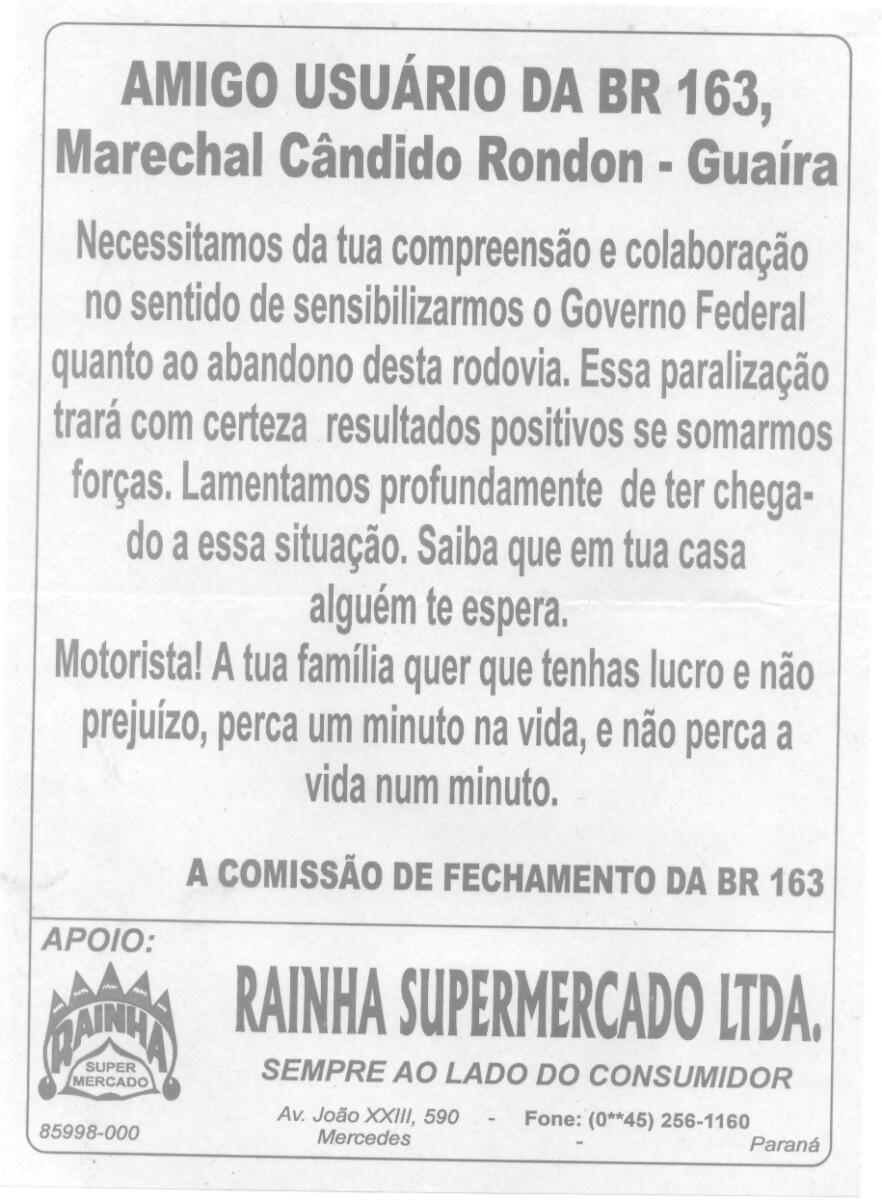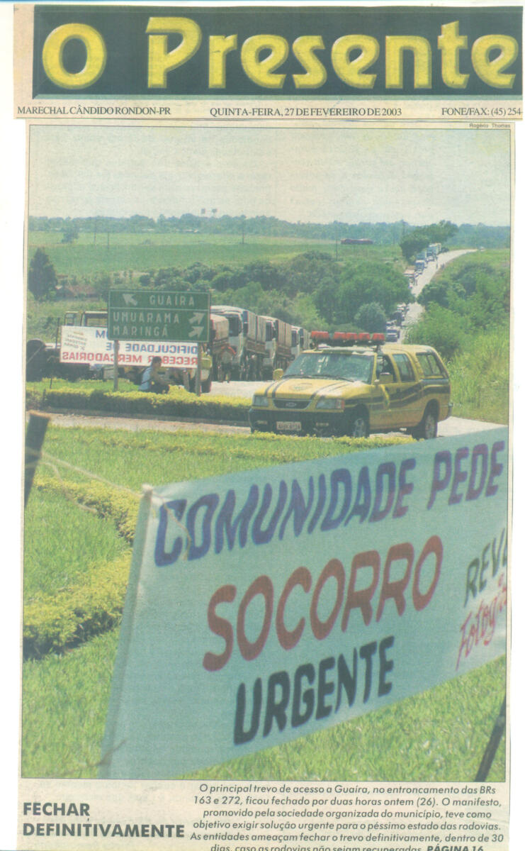 Meio ano depois, já em 2003, no dia 26 de fevereiro, foi a vez de Guaíra tomar para si as dores de estar isolada no Oeste, devido ao abandono da BR-163. Naquele dia, lideranças do município guairense organizaram o fechamento no principal trevo de acesso à cidade.