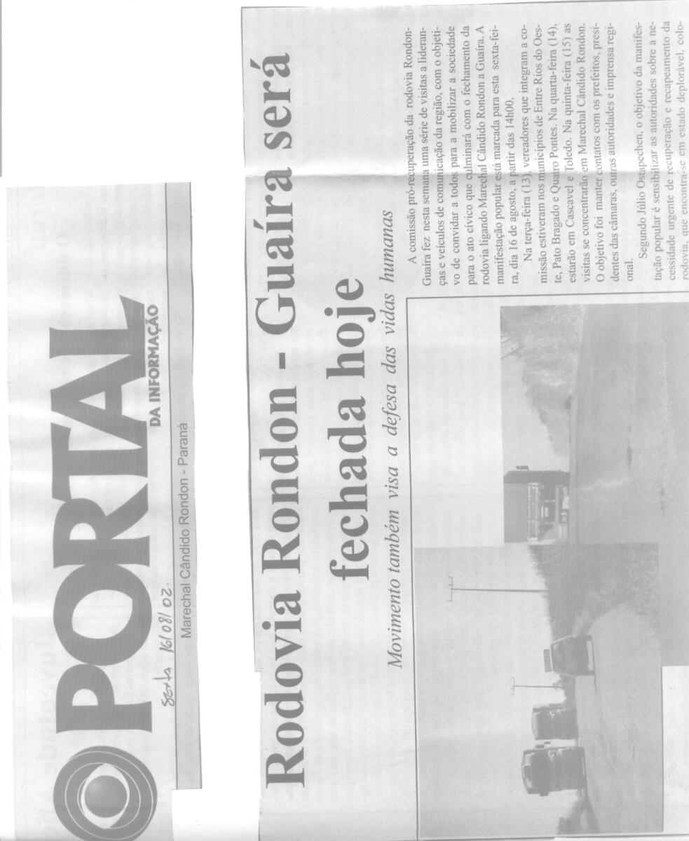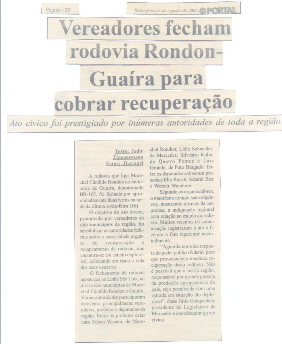 No ato histórico, vereadores e lideranças de Marechal Rondon, Mercedes, Pato Bragado, Entre Rios do Oeste, Quatro Pontes, Terra Roxa, Nova Santa Rosa e Guaíra, vinculados à Associação das Câmaras e Vereadores do Oeste do Paraná (Acamop), se reuniram, no dia 16 de agosto de 2002, para sensibilizar o Poder Público quanto às condições da rodovia, consideradas precárias.